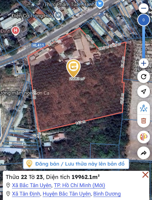Cần bán gấp lô đất lớn 19962.1m² tại Đường DT746B, Xã Tân Định, Huyện Bắc Tân Uyên, Bình Dương. Lô đất sở hữu vị trí đắc địa với 3 mặt tiền đường nhựa, chiều ngang 97.1m, giao thông thuận tiện. Rất phù hợp để phát triển các dự án kinh doanh đa dạng như xây dựng nhà hàng, quán ăn, cửa hàng, văn phòng, hoặc đầu tư làm đất nền, xây nhà trọ cho thuê. Khu vực gần trường học cấp 1-2 và trạm y tế, mang lại nhiều tiện ích. Giá bán: 70 tỷ.