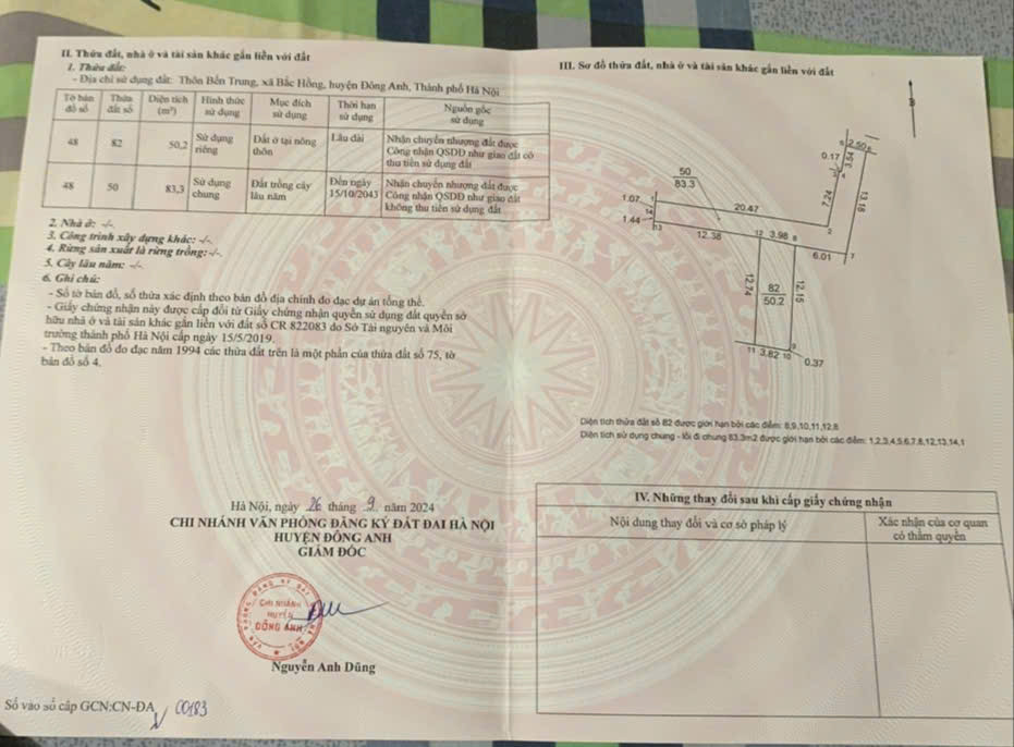 Cơ hội đầu tư đất nền với diện tích 50m² vuông vắn, phong thủy tốt, tọa lạc tại khu vực phát triển. Lô đất có sổ đỏ sẵn sàng, pháp lý minh bạch, đảm bảo giao dịch an toàn. Mặt tiền 4m, đường bê tông rộng rãi, cách đường nhựa chỉ 15m. Xung quanh là hệ thống tiện ích đầy đủ với trường học các cấp (1-2-3), chợ và trạm y tế trong bán kính 300m. Dễ dàng kết nối với trung tâm và các khu vực trọng điểm khi chỉ cách Cầu Nhật Tân và Sân bay Nội Bài 4km. Giá bán hấp dẫn chỉ 2.65 tỷ.