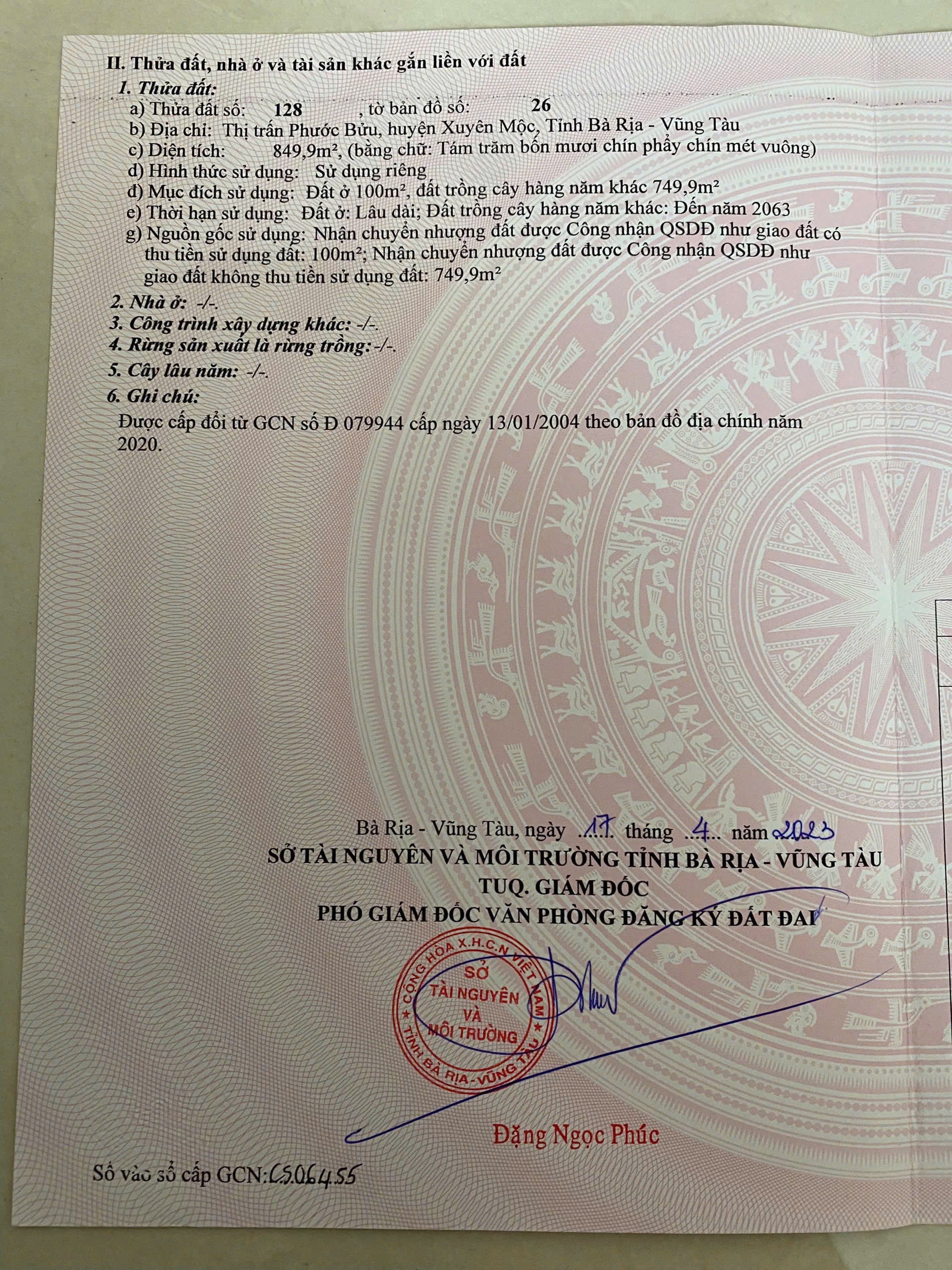 Cần bán lô đất đẹp tại xã Hồ Tràm, TP HCM, phù hợp đầu tư lâu dài hoặc xây dựng nghỉ dưỡng. Diện tích: 849,9m², đất ở: 100m² (đã có sẵn), ngang: 20m – đất vuông vức, dễ quy hoạch. Pháp lý: Sổ hồng riêng, sang tên nhanh. Đường: Ô tô vào tận đất. Giá bán: 6.1 tỷ (còn thương lượng cho khách thiện chí).