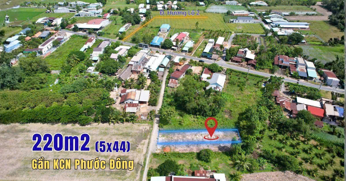 Chính chủ cần bán đất xây trọ (5x44) nằm trong khu dân cư hiện hữu, cách đường nhựa chỉ 100m. Diện tích 224m², thổ cư hiện hữu. Vị trí thuận lợi gần KCN Phước Đông, đầy đủ tiện ích như chợ, trường học, bệnh viện. Đất có pháp lý rõ ràng, sổ hồng riêng chính chủ, mới ra tháng 9/2025. Giá 990 triệu còn thương lượng. Tiềm năng đầu tư tăng giá cao khi hạ tầng được cải thiện.